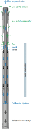 The GasAL downhole gas separator was designed using standard oilfield tubulars and connections, ensuring compatibility with conventional completion designs. The separator geometry was optimized to maximize annular flow area, thereby reducing liquid phase velocity and enhancing gas/liquid separation efficiency. Within the separation zone, the lower annular flow velocity facilitates gas bubble rise through the emulsion while allowing solids/liquids to settle below the separation zone. The resulting low GVF fluid then enters a free-fall dip tube, which leverages gravity by positioning the intake on the low side of the separator. This promotes additional natural, gravity-based gas separation before the fluid is directed toward the PCP intake, improving liquid volumetric efficiency and overall pump performance.
