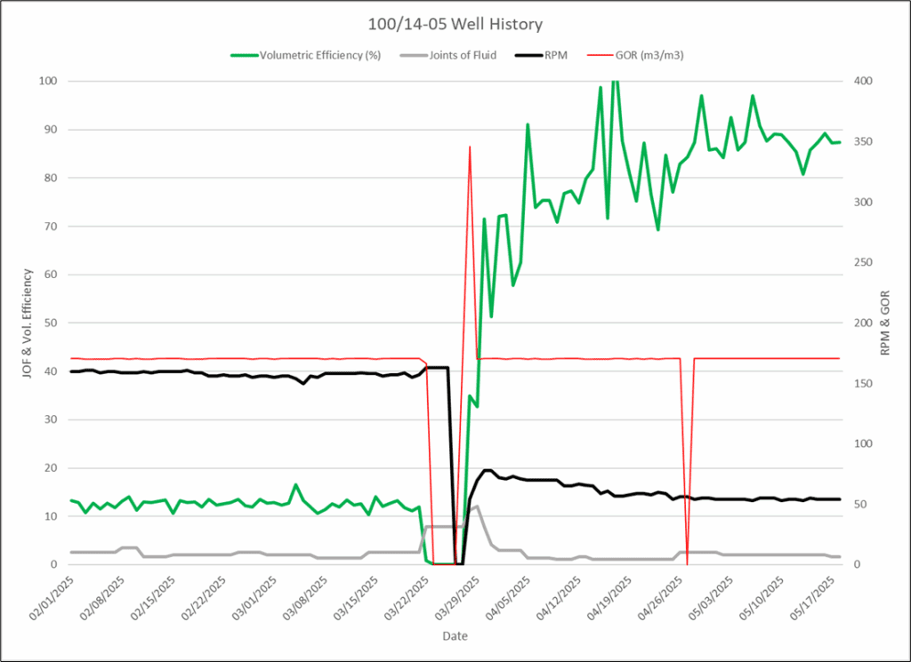As of October 2025, the GS700 GasAL and 036-1200 TaperAL PCP configuration remains in continuous operation, maintaining improved volumetric efficiency and stable production performance.