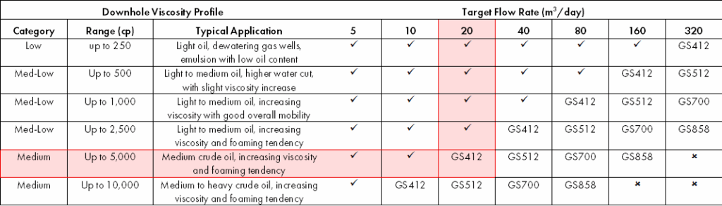 Based on the operating conditions, this application aligns with the GS412 series specifications. However, given the 177.8 mm casing, the larger GS700 series can be utilized to further reduce fluid velocity within the separator. The reduced velocity enhances the relative rise of liberated gas bubbles, improving separation efficiency and minimizing gas carryover into the pump intake.