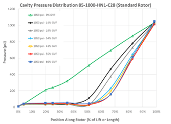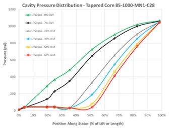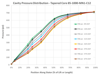 In high GVF conditions, conventional PCPs tend to concentrate the majority of gas recompression work at the discharge end, leading to localized thermal and mechanical stress. The TaperAL design mitigates this effect by redistributing the workload more evenly, reducing peak stress and delaying elastomer degradation. This results in improved durability, extended runtimes, and reduced likelihood of premature failure.