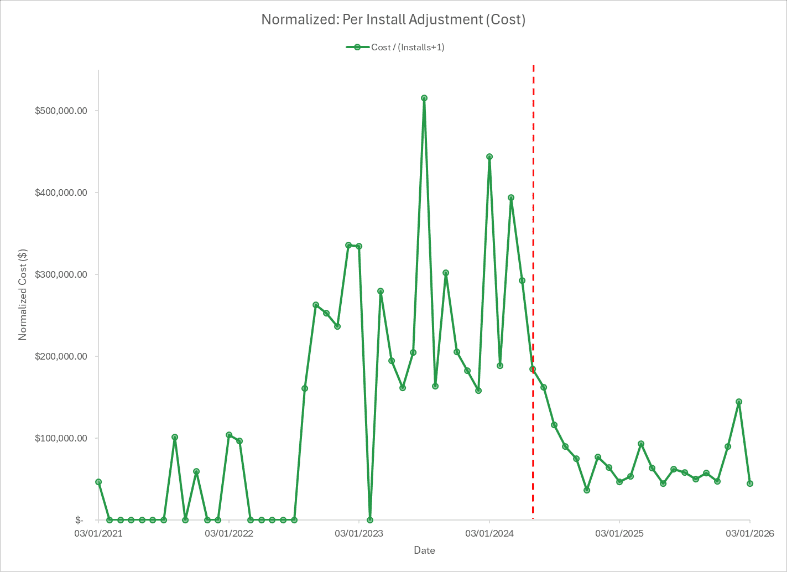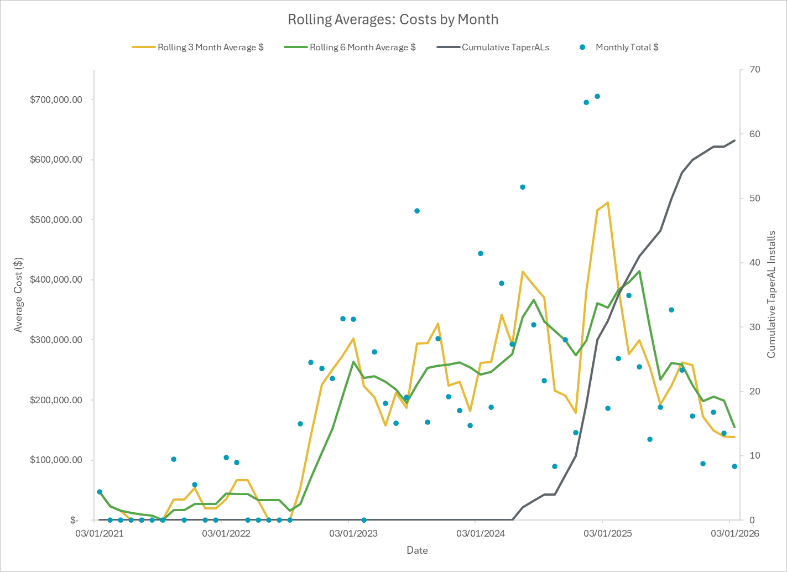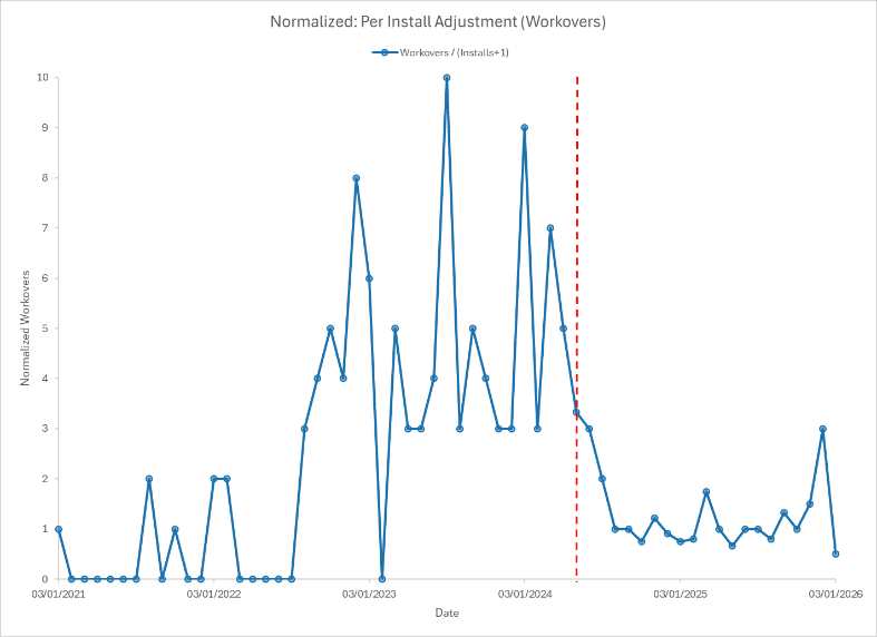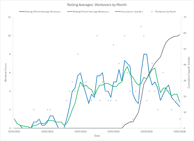 To further assess performance, workover frequency and cost data were normalized relative to the number of TaperAL installations. This normalization accounts for the rate of deployment and provides a per-installation performance metric. The analysis demonstrated that each incremental TaperAL installation corresponded to a substantial reduction in workover burden and associated costs. Specifically, workovers per installation decreased by approximately 49%, while cost per installation decreased by approximately 44%.
